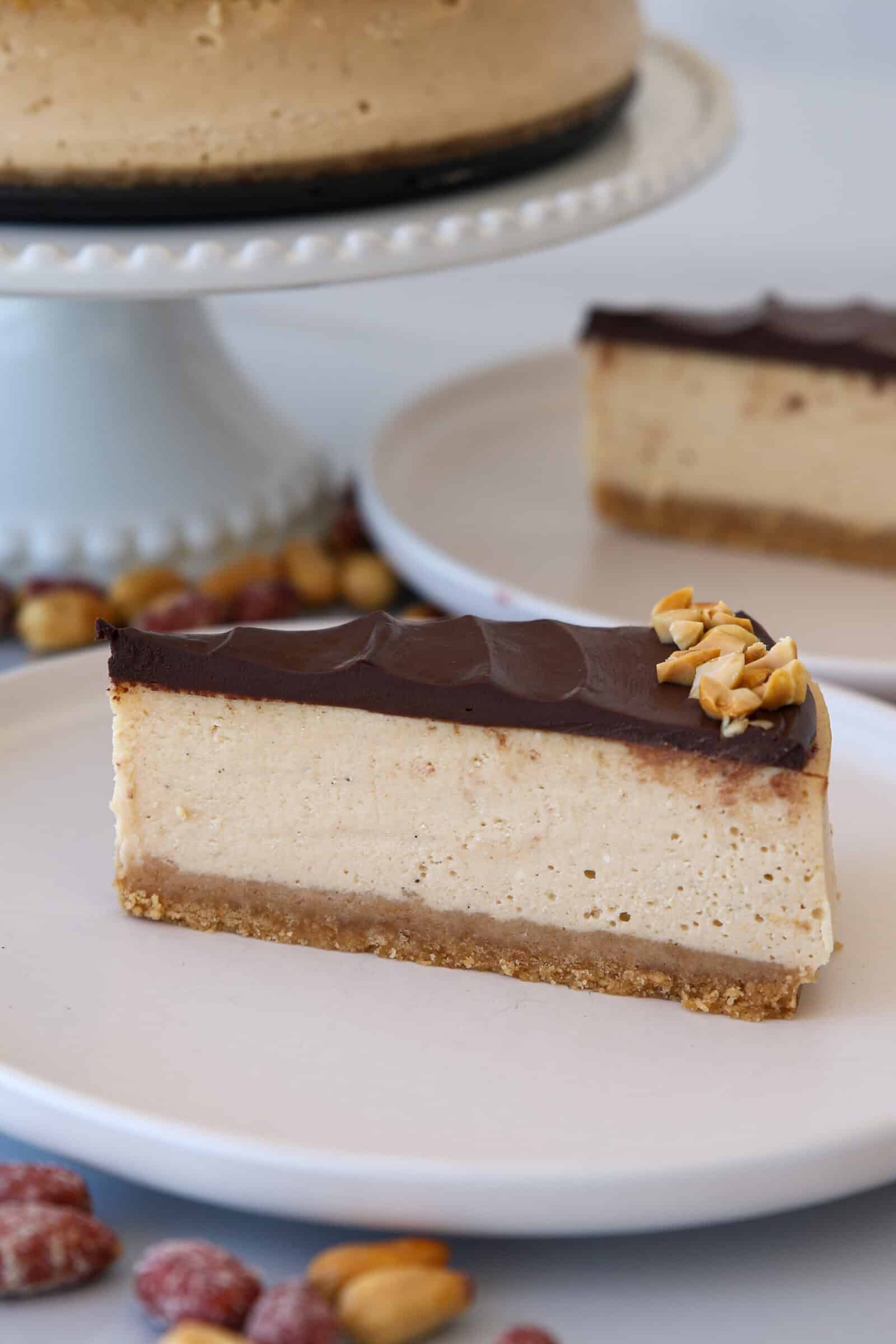 If you’d like to switch it up, try a salted caramel drizzle, crushed peanut butter cups, whipped cream with chopped peanuts, or even a swirl of peanut butter on top of the cheesecake before serving.